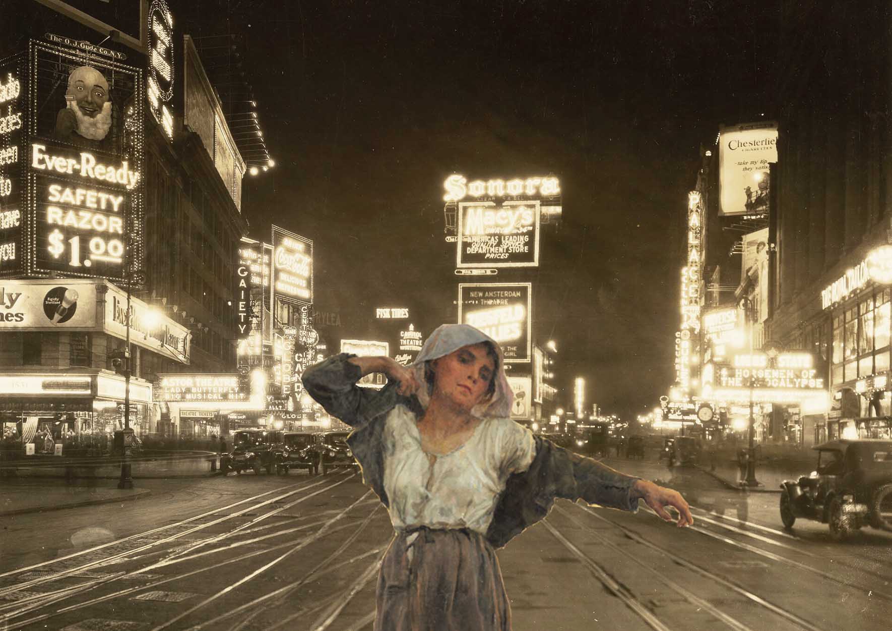 Die Stadt leuchtet in grellem Glanz: Reklamen flackern, Menschen eilen, der Lärm der Moderne füllt jede Gasse. Und doch steht sie da, als hielte die Zeit kurz den Atem an: eine Frau, einfach gekleidet, erschöpft vom Tag und zugleich wie aus einer anderen Zeit.