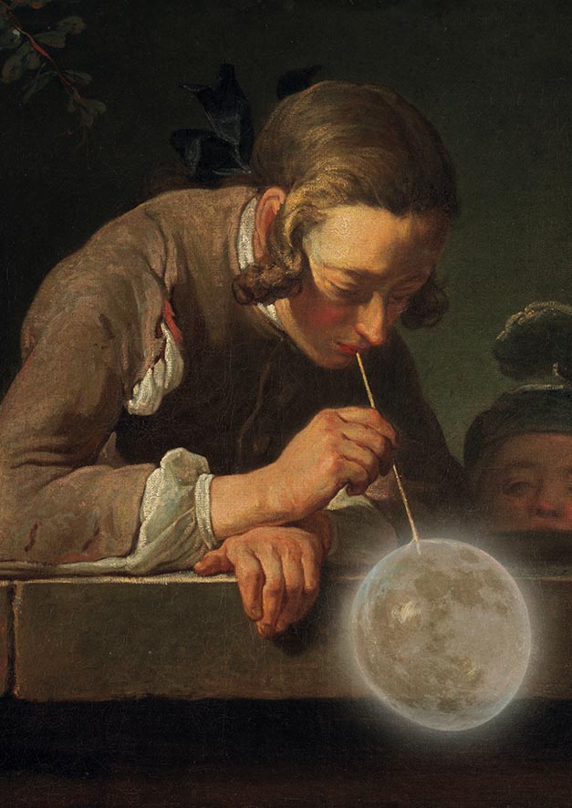 Ein junger Mensch sitzt versunken, das Gesicht halb im Licht, halb im Schatten, und bläst, fast beiläufig, den Mond auf. Kein Spiel, sondern ein Akt der stillen Vorstellung: Die Welt als etwas, das sich formen lässt und zwar nicht mit Gewalt, sondern mit Atem, Geduld, Fantasie.